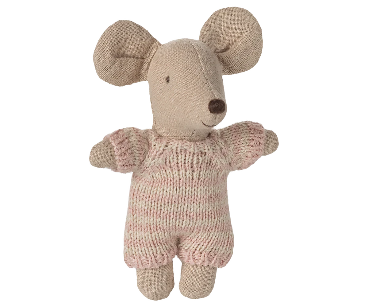Un adorable bébé souris vêtu d'une combinaison, en tricot, douce et rayée. Bébé souris dort pendant des heures dans son couffin matelassé et peut être transporté dans toutes vos escapades.