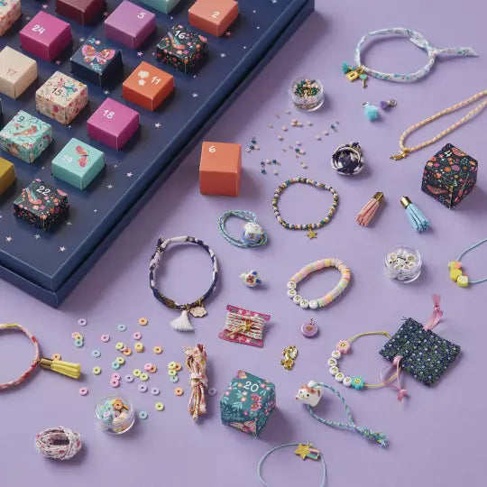 Un magnifique calendrier de l'avent composé de 24 petites boites illustrées à ouvrir chaque jour. 24 magnifiques surprises créatives à découvrir pour réaliser 24 bijoux ! Le calendrier propose du matériel de qualité : de nombreux fils et rubans, des perles porcelaine, des pochons en Liberty, des pompons, des charms, des perles lettres