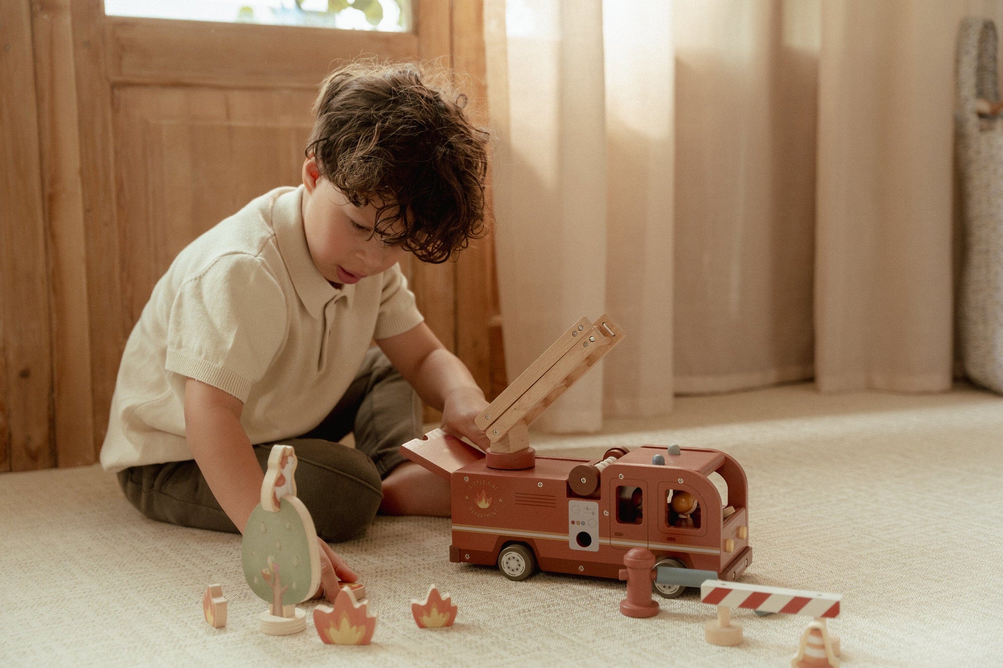 Sauvez le chat de l’arbre ! Ce camion de pompiers en bois est équipé d’une échelle extensible et d’un tuyau d’incendie détachable, pouvant se connecter à la bouche d’incendie ou au camion. L’ensemble comprend quatre pompiers, des flammes et une bouche d’incendie. À combiner avec la caserne de pompiers pour encore plus de jeux.