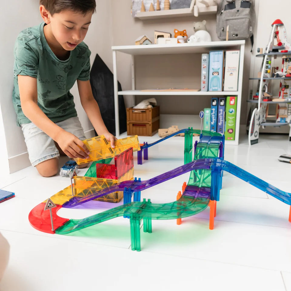 Le plaisir de la course, la vraie, sans fin et sans limites avec ce Kit circuit de 65 pièces de Cleverclixx. Ce set aussi amusant qu’intense initie votre enfant à la construction des pistes de course les plus cool sur différents niveaux. Pour un maximum de plaisir, des panneaux de signalisation, une petite voiture et des piliers de pont sont inclus dans le set.