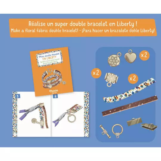 Confectionne un splendide BRACELET EN LIBERTY et EN CUIR PAILLETÉ grâce aux accessoires de ton coffret ! Matériel : • 2 cordons en Liberty • 1 lanière en cuir pailleté • 2 charms • 2 perles bélières • des anneaux de raccord • 1 fermoir et des embouts