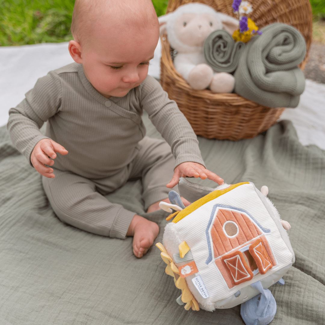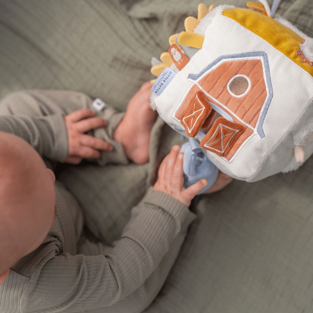 Aventure à la ferme. Ce cube d'activités super doux aux tons doux suscitera certainement la curiosité de votre petit. Chaque côté est équipé d'une activité différente avec des textures et des formes différentes qui aident à développer les sens et, bien sûr, offrent un divertissement sans fin. Le cube peut être saisi et tourné et possède un miroir pour l'auto découverte.