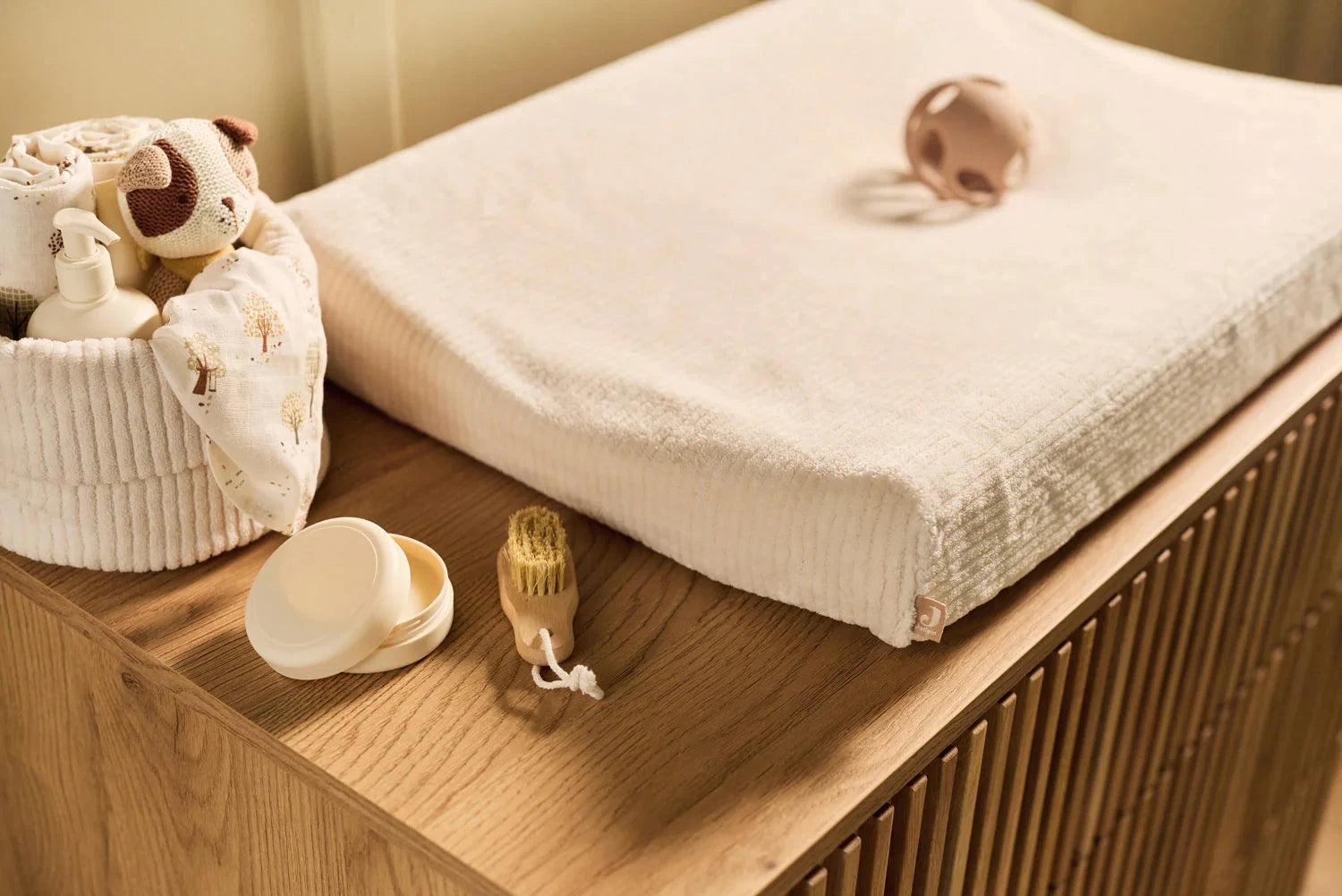 Cette housse pour matelas à langer en coloris Oatmeal est fabriquée en tissu côtelé ultra doux à l’extérieur. Grâce au bord élastiqué, elle reste parfaitement en place. Le tissu offre non seulement du confort, mais crée aussi une ambiance chaleureuse pendant le change. Un choix à la fois pratique et adorable pour la chambre de bébé !
