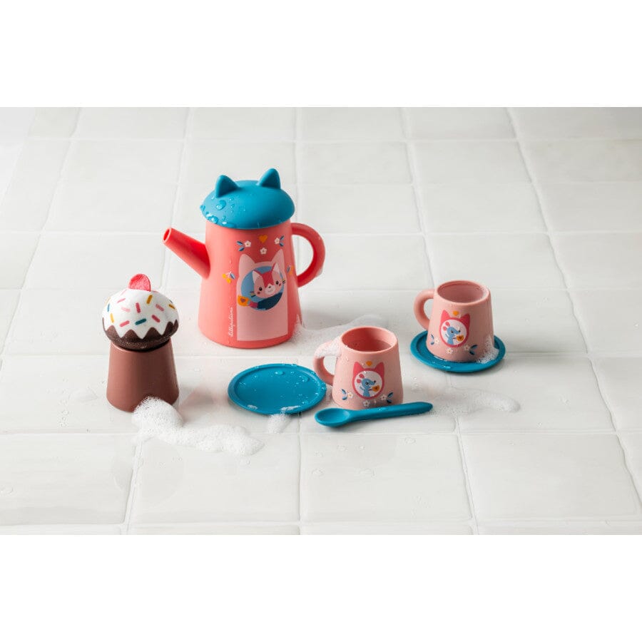 Prêts pour un goûter tout en éclaboussures ? Voilà un jouet de bain original : un set de thé, pensé pour les enfants à partir de 18 mois. Pour jouer dans l’eau comme en dehors, façon dinette, cette théière et ses accessoires sont parfaits pour imiter les grands ! Composé de 9 pièces, ce service à thé comprend : une théière à l’effigie de Jeanne le chat et son couvercle en silicone avec petites oreilles de chat, deux tasses illustrées avec des petites souris, deux sous-tasses, une petite cuillère, un muffin en deux parties pour un entretien facilité. On verse, on renverse, on transvase … Quel autre endroit convient mieux que le bain pour ça ? Vous le savez peut-être, mais notre Jeanne adore prendre le thé avec ses amies. C’est le moment pour elle de se détendre, un peu comme l’heure du bain finalement ! Ce jouet d’imitation convient aussi bien pour jouer dans l’eau que pour s’amuser en cuisine. Avec ses accessoires gourmands, il invite à la convivialité à toute heure de la journée ! Un petit goûter avec mamie ? Un gros plouf dans la baignoire ? Une séance d’arrosage pour se rafraichir lors d’une chaude journée ? Ce sont les enfants qui décident ! Pensé pour un séchage facile, il vous suffit de rincer le set à l’eau claire et de laisser sécher toutes les pièces jusqu’à la prochaine utilisation.