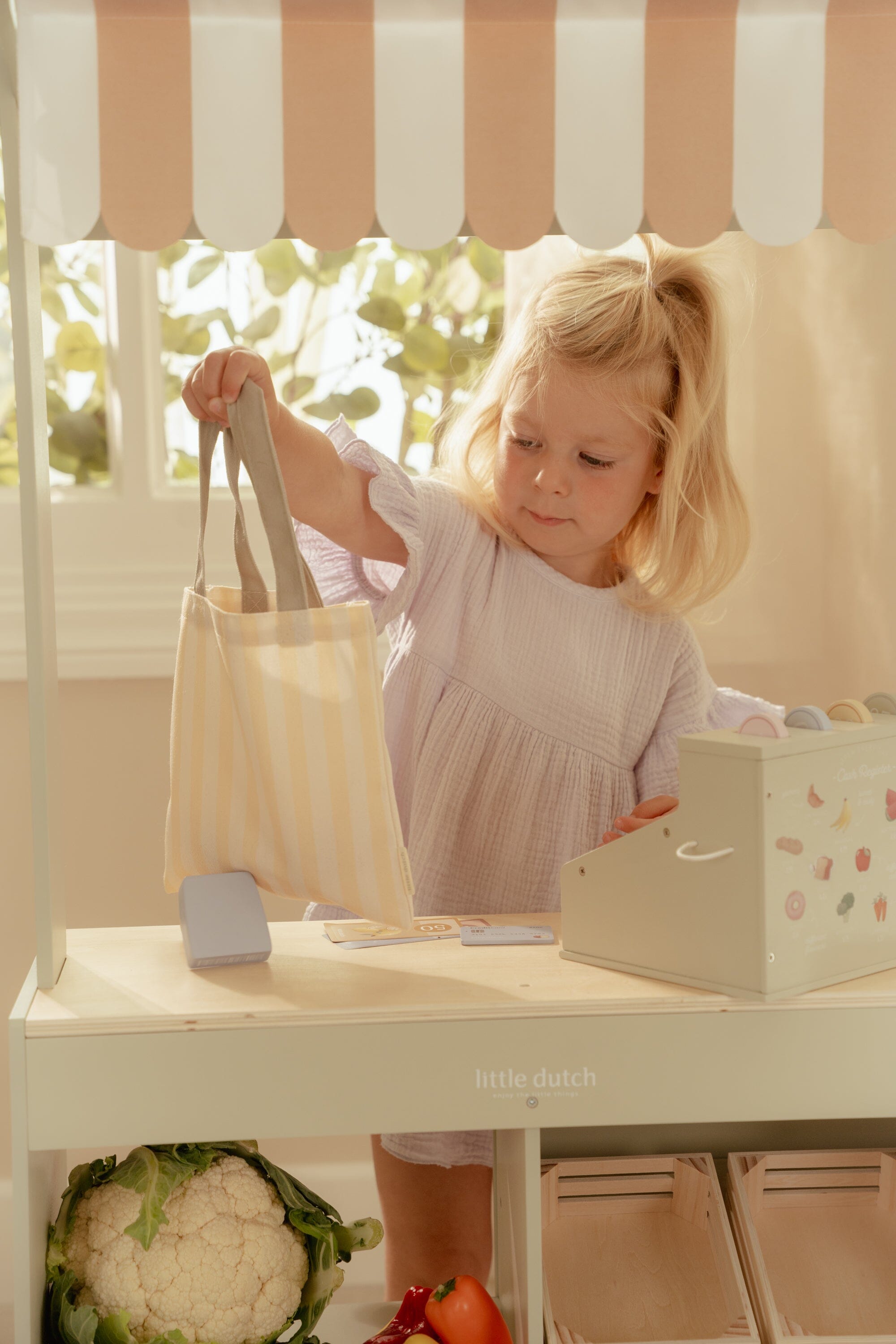Offrez aux enfants leur propre petit magasin avec le marché des petits commerçants de la marque Little Dutch, un magnifique étal en bois FSC idéal pour les jeux d’imitation. Grâce à son auvent en tissu, son tableau noir et ses cartes illustrées, ce stand recrée l’ambiance d’un vrai marché et invite les petits à inventer des histoires, vendre leurs produits et accueillir leurs clients comme de vrais commerçants.