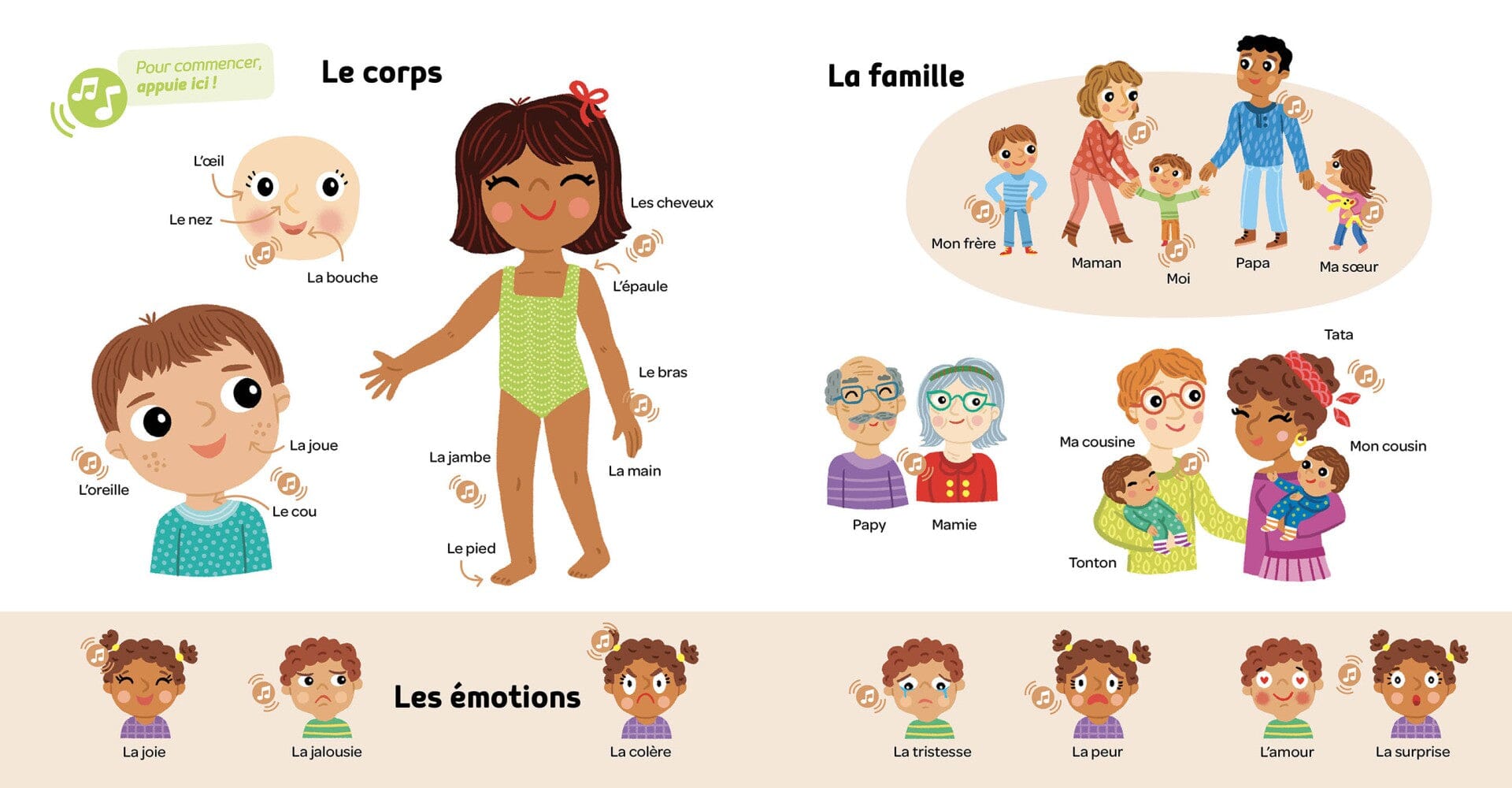 Les 500 mots sont regroupés en univers simples et adaptés aux plus petits (corps, maison, repas, saisons, couleurs et formes, etc).