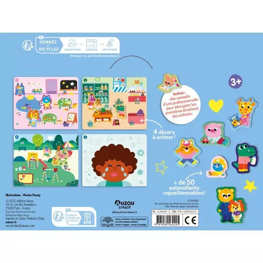 Une activité ludique pour aider à l'apprentissage des émotions ! La pochette propose 4 décors à animer à l'aide de 50 autocollants en relief repositionnables à l'infini, faciles à manipuler par des petites mains. L'activité est accompagnée d'un livret de conseils d'une professionnelle afin d'accompagner le parent dans l'apprentissage des premières émotions des enfants !