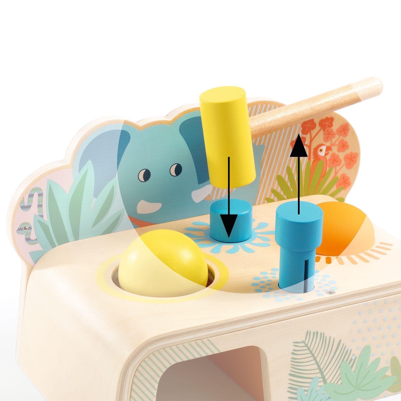 Multi Tap est un jouet en bois qui permet à l'enfant de découvrir 3 manières différentes de taper avec un marteau. Il tape sur la boule, qui ressort par la porte. Il tape sur un cylindre bleu, ce qui fait ressortir l'autre. Et il tape sur le champignon, qui fait un bruit de pouet.