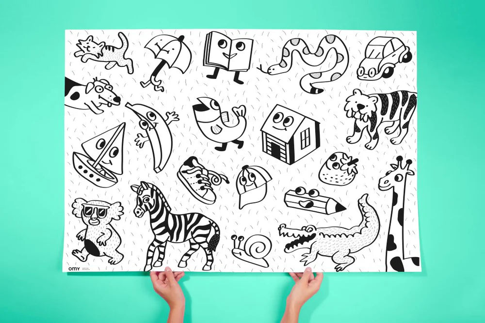 Un poster géant avec de grandes illustrations pour laisser les plus petits exprimer leur créativité avec des feutres, des crayons cires ou de la peinture.