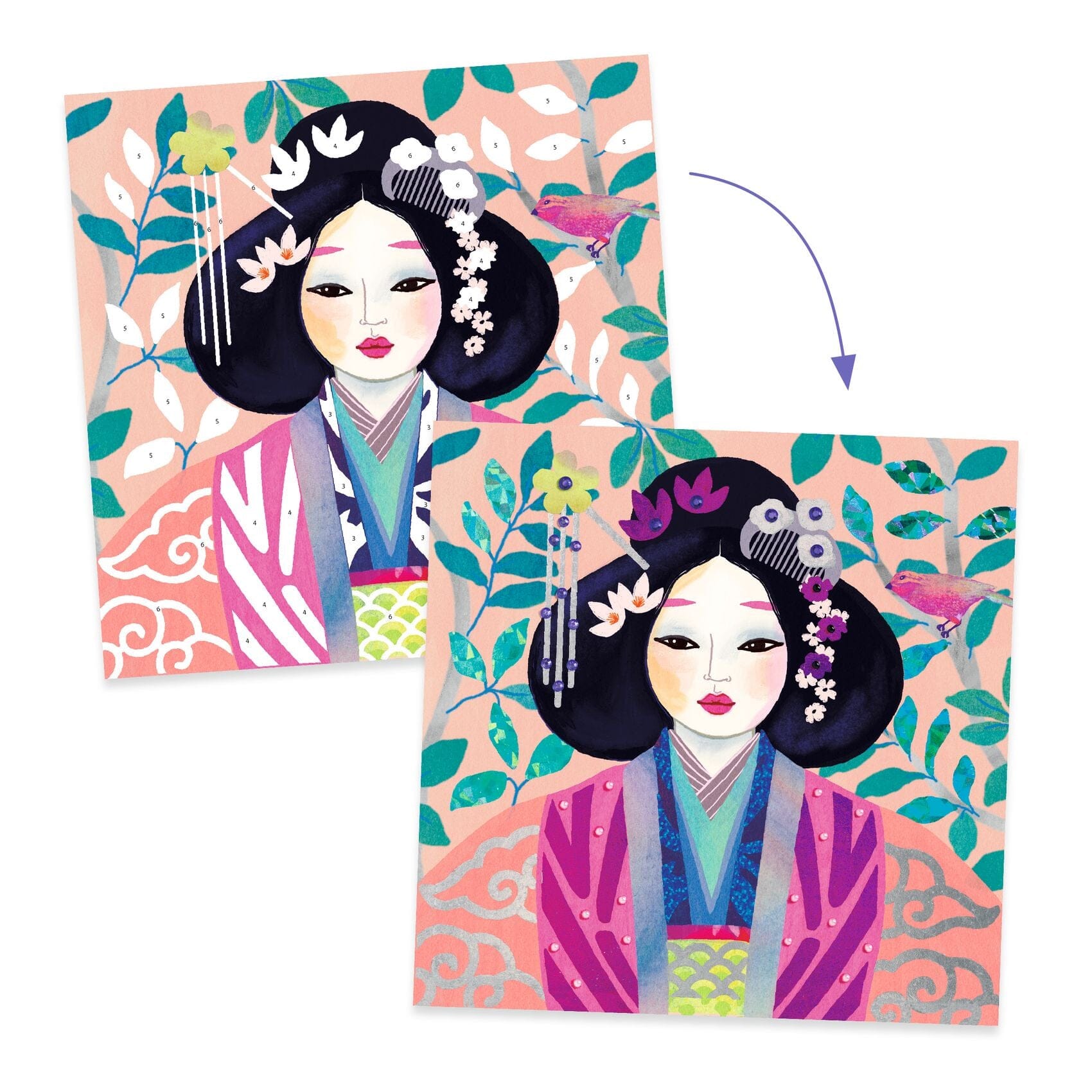 4 cartes illustrées et préencollées (20 x 20 cm), 1 assortiment coloré de feuilles de métal à déposer, des strass autocollants, 1 livret d'explications pas à pas.