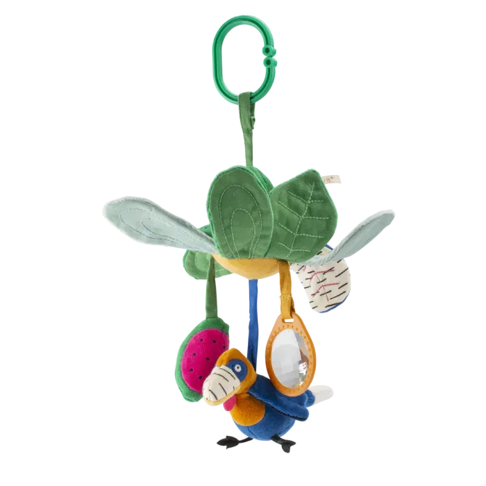 Facile à accrocher à une arche d’éveil, une poussette ou un lit, cette fleur devient rapidement un compagnon ludique du quotidien.