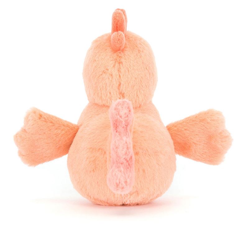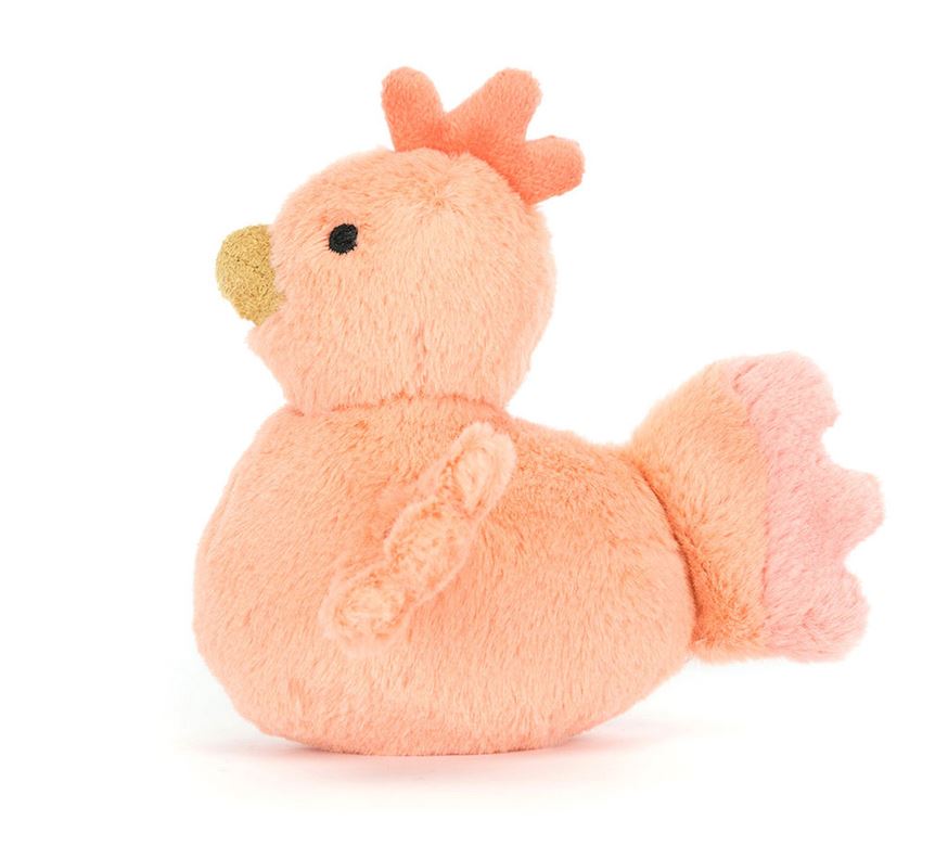 Fluffy Chicken est un oiseau très fier, avec une fourrure abricot, un peigne bicolore et un bec en suédine moutarde ! Dodue et équilibrée, avec des ailes en éventail et une magnifique queue assortie, cette poule câline fait la loi !