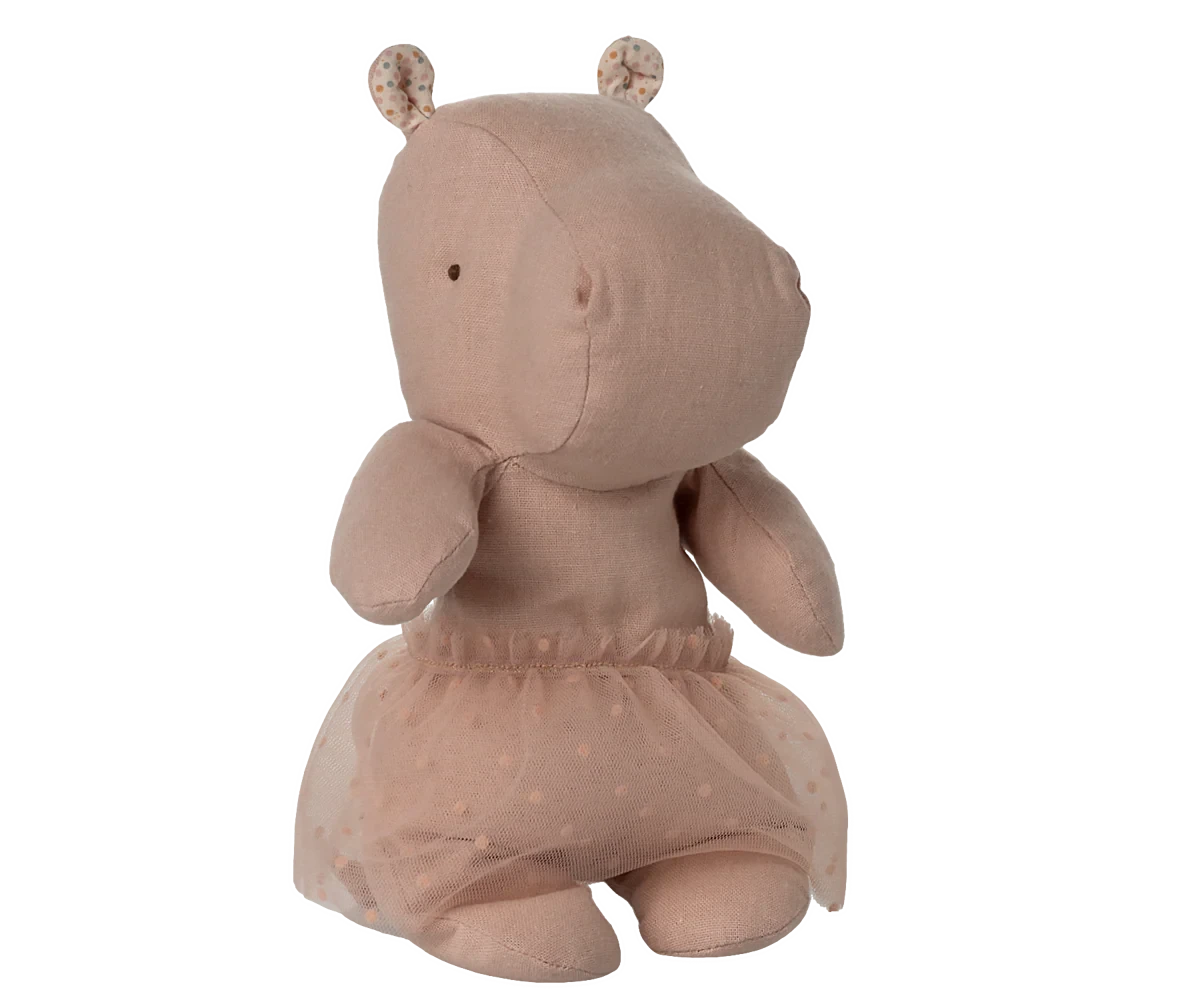 Le Safari Friends Hippo Maileg en coloris soft rose, vêtu de sa jolie jupe, est un compagnon plein de tendresse qui invite aux câlins et aux jeux imaginatifs. Avec son expression douce et ses matières moelleuses, il s’intègre parfaitement à l’univers poétique et chaleureux de Maileg.