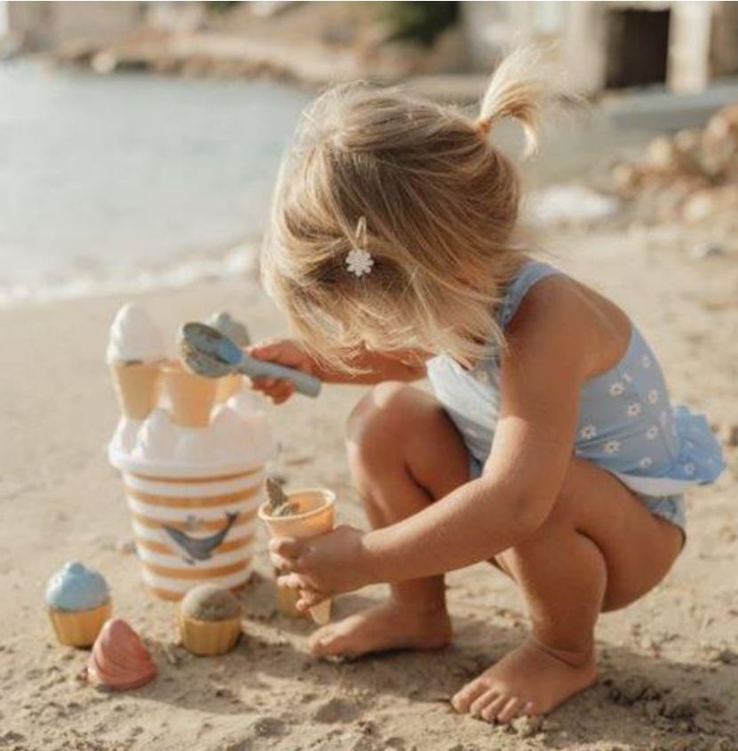 Quelle glace voulez-vous ? J'ai de la glace à la vanille et à la fraise, ainsi que des petits gâteaux ! C'est ton jeu Ocean Dreams Blue préféré à emmener à la plage ou au bac à sable. Il permet de s'amuser et de faire preuve d'imagination à l'infini. Avec la cuillère à glace et les 4 moules, votre enfant remplira d'innombrables cornets et pots de glace au goût de sable pour tous ceux qui le souhaitent. Le seau contient non seulement tous les éléments de l'ensemble, mais il permet également d'aller chercher de l'eau et, grâce au couvercle, de contenir les cornets de glace préparés.