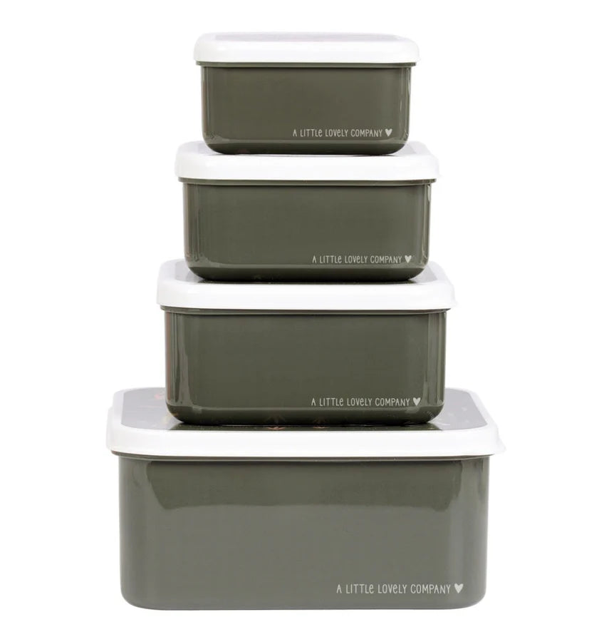 Dimensions : boîte à lunch 15,8 x 14 x 7 cm, grande boîte à goûter 12 x 12 x 5,5 cm, boîte à goûter moyenne 10,5 x 10,5 x 5 cm, petite boîte à goûter 9 x 9 x 4,5 cm.