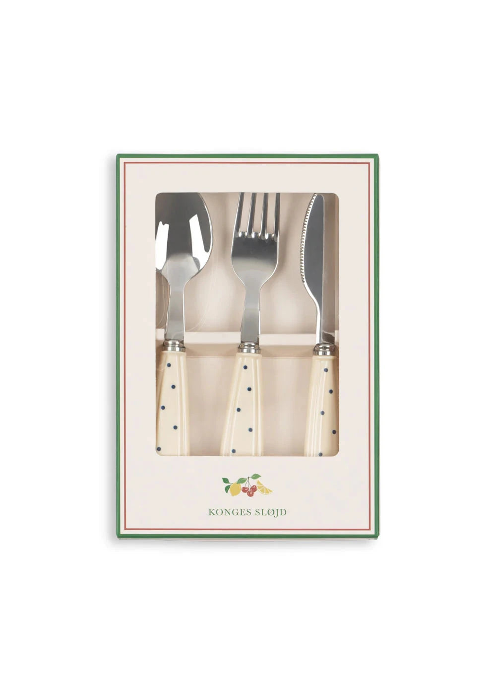 Ensemble de couverts orné du joli motif cerises signature de Konges Sløjd et d'une forme ondulée. Fabriqué en acier inoxydable avec des manches en PCTG.
