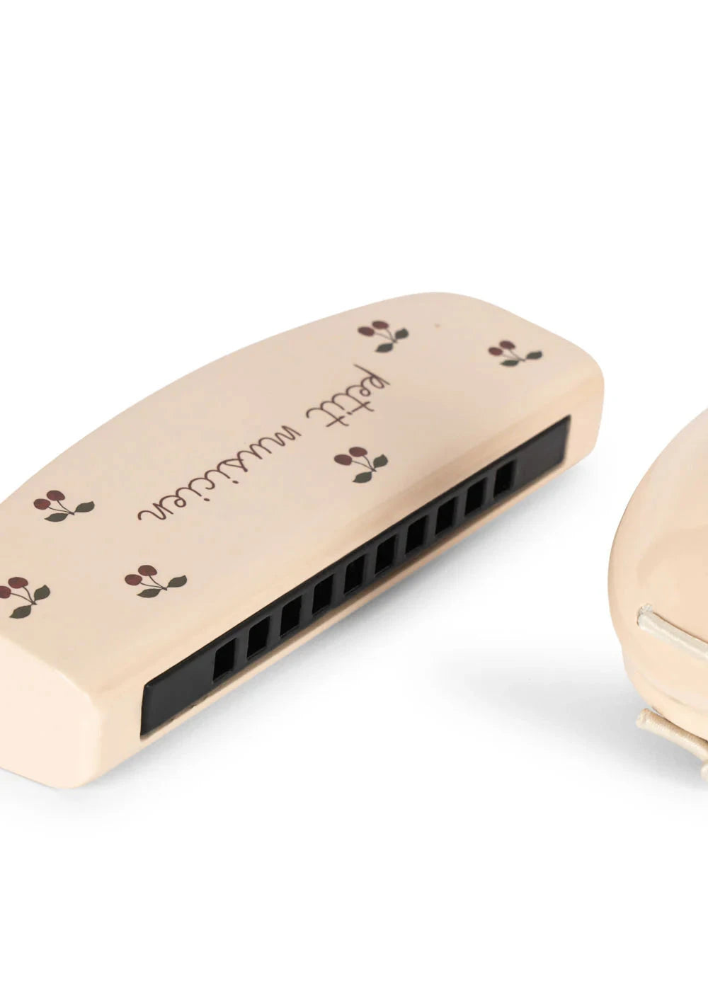 Ensemble d'instruments de musique en bois, comprenant un harmonica, des maracas et une castagnette.