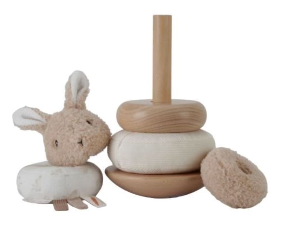 Ce jeu d'empilage d'anneaux en bois et en textile pour enfants de la collection Baby Bunny est conçu pour développer la coordination œil-main.