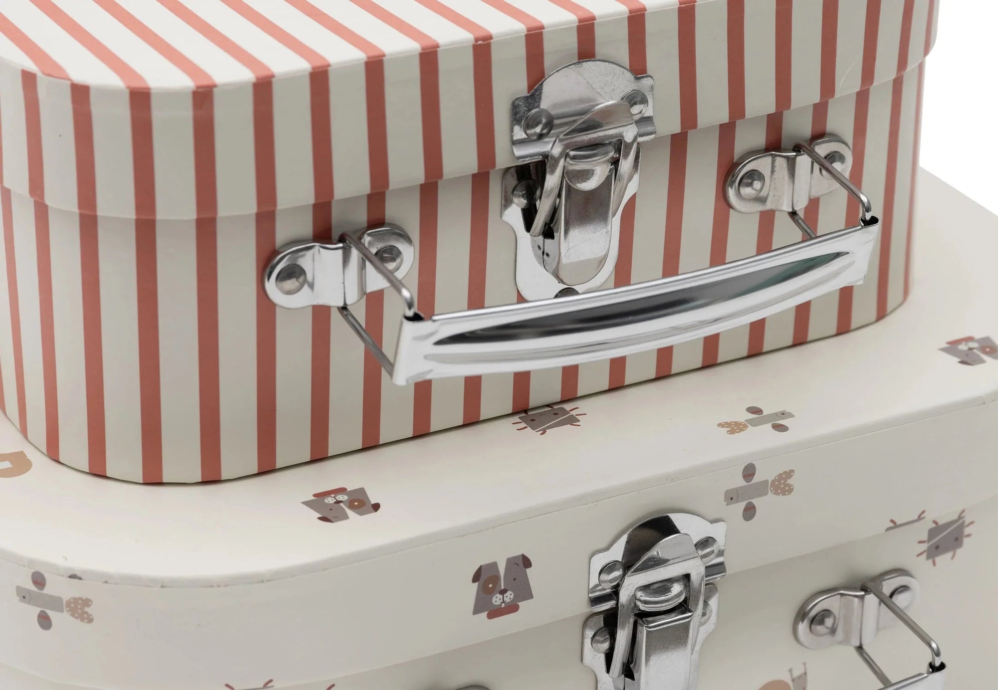 Ces valises de la collection Animal Friends sont parfaites pour votre enfant ! L'extérieur de la valise est orné d'un imprimé joyeux, tandis que l'intérieur est de couleur terra douce avec un adorable petit chien. L'intérieur présente un motif à carreaux Milky Coffee et la mention « belongs to ». Idéal pour ranger de petits objets ou comme décoration originale dans la chambre de bébé !